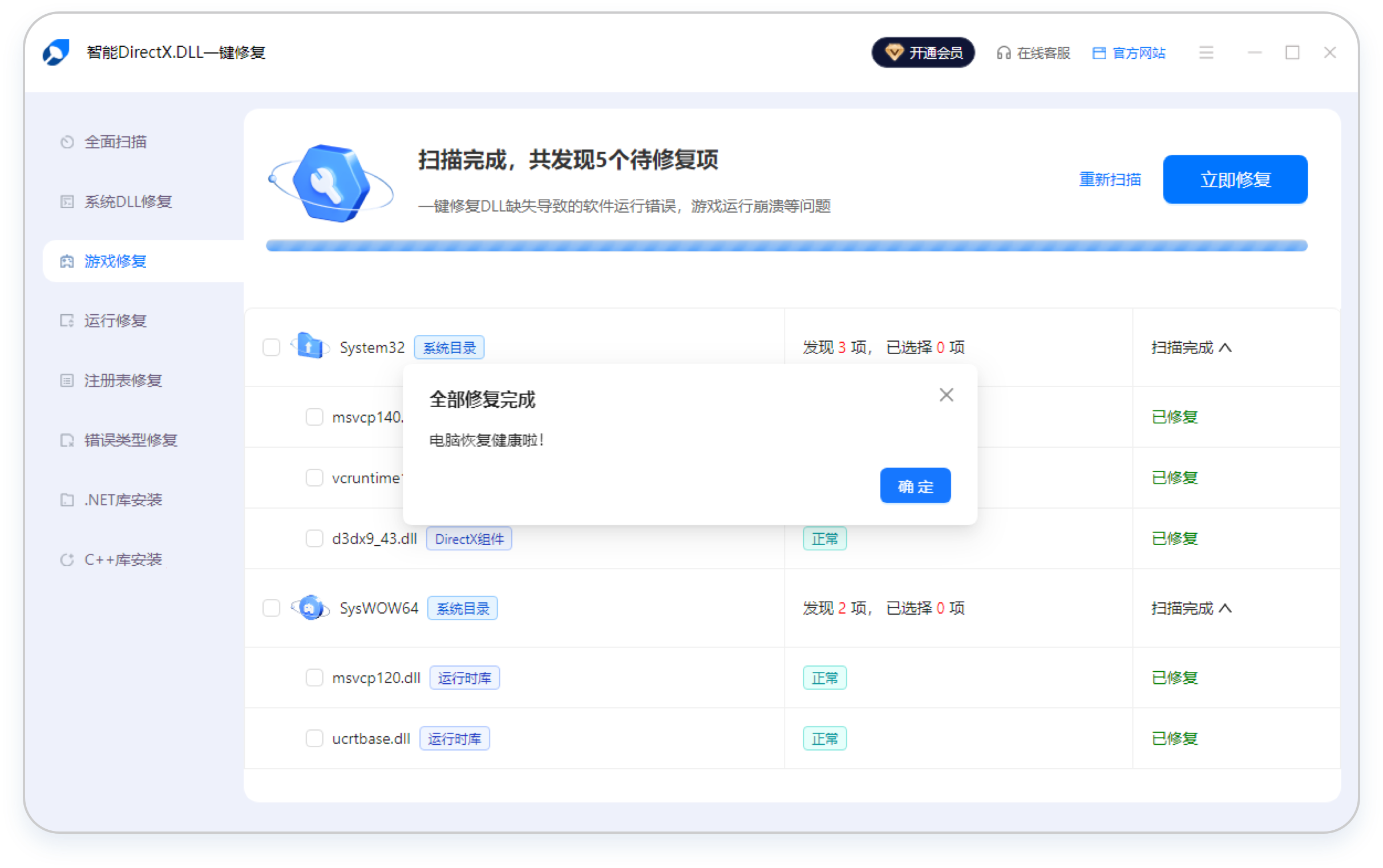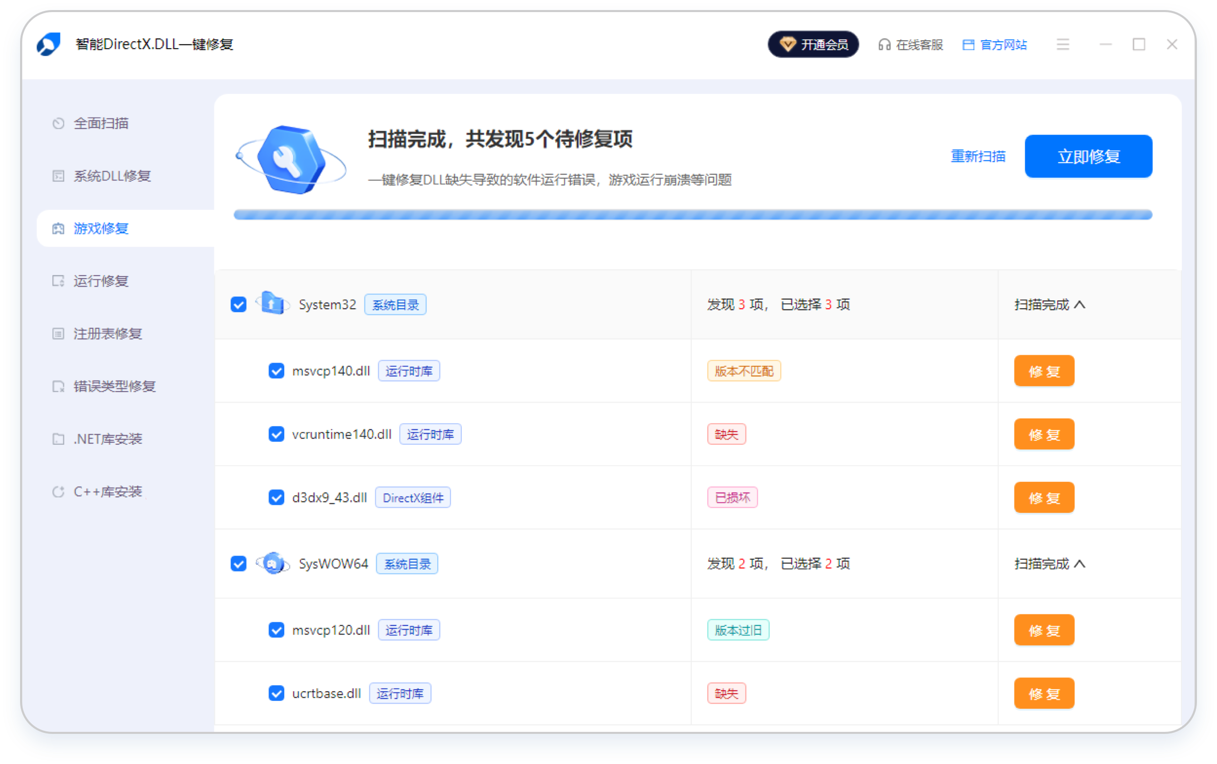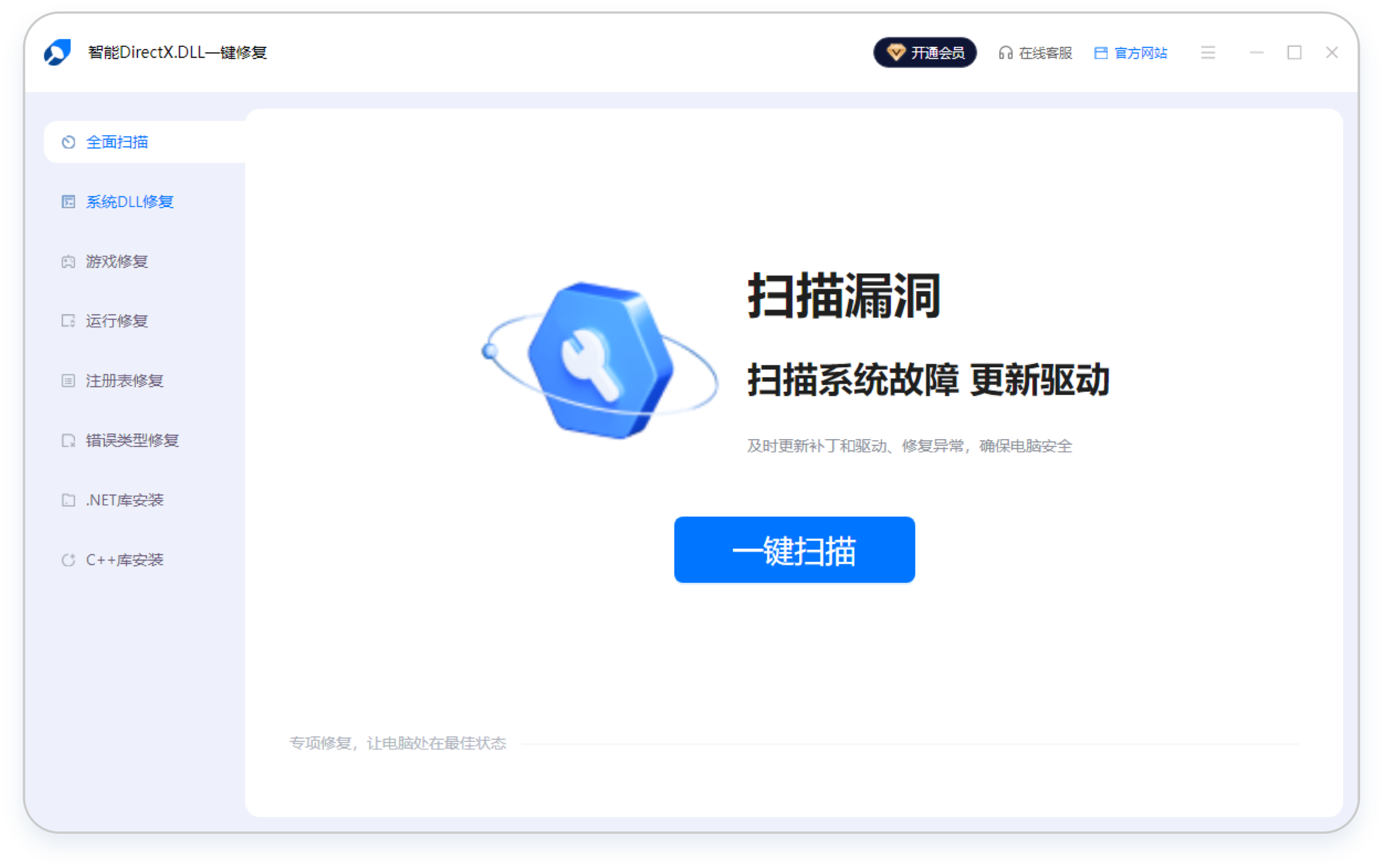 一键自动检测电脑缺失的运行库和DLL文件,自动修复各 类dIl缺失等问题,无任何操作难度,小白友好